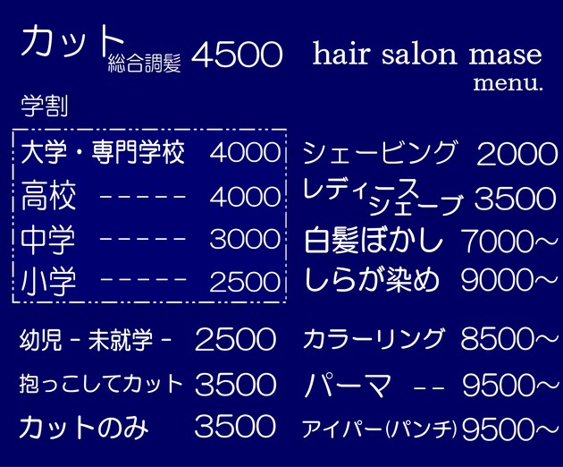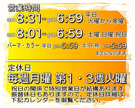 予約制ではありません。 入店の順番順になります。 店の敷地から出たら順番は最後尾になります。 近隣のコンビニ等に行かれ、店を離れる際は最後尾になります、ご注意ください。 敷地内の「喫煙スペースでの喫煙」は順番の変動はありません。 喫煙スペースは中庭、ガチガチに条例に則り設置しています。 □□□□□□□□□□□□□ 営業時間の情報 年末年始やイベント時に変更になります。 前もって情報をお知らせしますので、お盆時や年末年始などにはご確認いただけると幸いです。 物凄く暇なときには、ちょっと早めに閉まることがあります。 ご注意ください。 □□□□□□□□□□□□□ 休日について 月曜の祝日が多い関係上(ハッピーマンデー等) 振り替えでの休日変更が昨今、多くなっています。 基本は毎週月曜日・第一第三火曜日が定休日です。 祝日絡みでの変更が多々あります。 ご来店の際には一旦ホームページをご確認いただけると確実です。 □□□□□□□□□□□□□ 赤ちゃん筆、お受けさしていただいています。 赤ちゃん筆を作るにあたって 当店でカットした毛髪のみお受けします、他店でカットした毛髪はトラブル回避のため、お受けできません。 7センチ以上の毛髪長さが必要です。 予算はカット代金+筆代+送料。 筆の御代は出来上がりのお支払い、先払いは絶対にありません。 後払いの関係上、怪しい方、訳の分からない尊大な方の筆のお申し込みはお断りしています。 赤ちゃんは混雑を待てません。 土日は筆の説明もカットも出来る限りお避けください。 赤ちゃん筆に関してトラブル防止のために当店では以下のことは絶対にやりません。 「先に筆の代金をいただくこと」 「切った髪をお店で預かること」 □□□□□□□□□□□□□□□□□□□□□□□